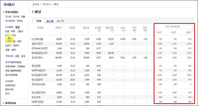 ▼어떤 종목에서 얼마의 배당금을 어느 기간 동안 주었는지 알 수 있습니다. 이에 더하여 해당 주식의 배당 성향, ROE, PER, PBR 등 여러 지표 확인이 가능합니다. 주식시장에 처음 발을 들여 놓았다면 ETF와 같은 것을 이용하는 것도 좋습니다.