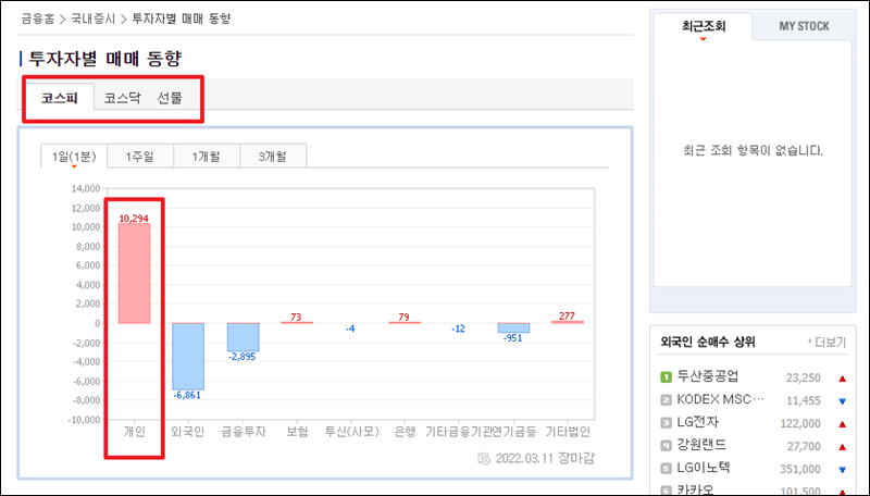 ▼국내 주식시장에 참여하는 투자자 종류는 몇 가지로 분류가 됩니다. 개인, 외국인, 금융투자, 투신, 기타 법인, 연기금 등이 있죠. 주식시장 종류와 기간에 따라 각 투자자가 어떤 포지션을 취하고 있는지 알 수 있습니다.