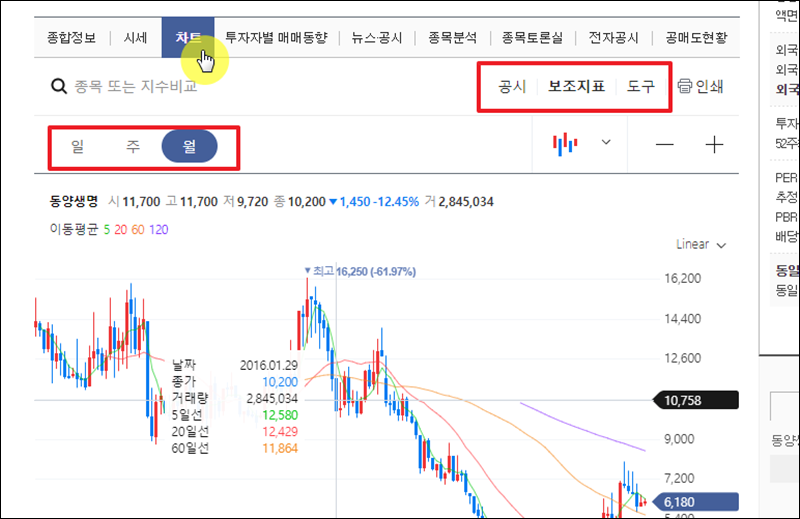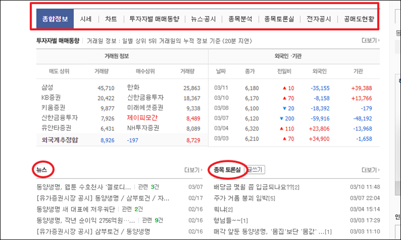 ▼간단한 정보 다음으로 종합정보, 시세, 차트, 투자자별 매매동향, 뉴스, 공시, 토론실, 전자공시 등 상세 정보를 확인할 수 있는 메뉴가 마련되어 있습니다.