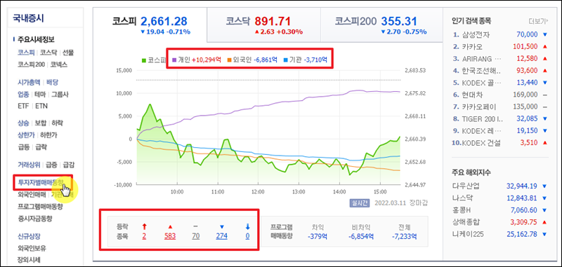▼[국내증시] 메뉴를 선택하여 열린 페이지를 보면 가장 먼저 지수 그래프가 눈에 띕니다. 현재 국내 주식시장 분위기를 파악하는 데에는 코스피, 코스닥 지수의 흐름을 파악하는 것이 좋습니다. 단순히 지표만 나오는 것이 아니라 개인, 외국인, 기관의 매매 금액과 등락 종목의 산태, 프로그램 매매동향 확인이 가능합니다. 시간이 흐름에 따라 매매 주체별 포지션 변화 확인도 가능합니다. 좌측에 보면 여러 가지 메뉴가 있는데, 여기에서 [투자자별 매매 동향]을 클릭해 보겠습니다.
