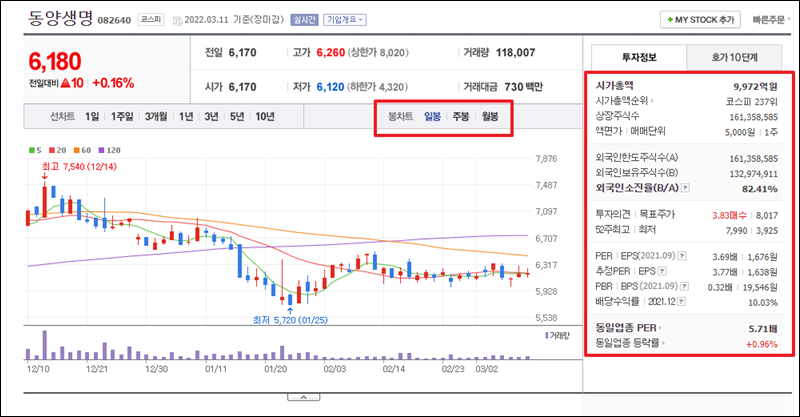 ▼마지막으로 개별 종목의 이름을 클릭하면 해당 종목에 대한 상세 정보 확인이 가능합니다. 가장 먼저 기본 그래프와 투자정보에 대한 것을 알아볼 수 있습니다. 시가총액, 상장주식수, 액면가 등 도움이 되는 정보가 많습니다.