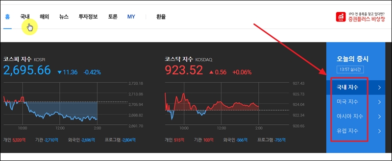 ▼사이트에 접속하면 홈페이지 메인화면에서 코스피와 코스닥 지수를 만나볼 수 있습니다. 개별 주식 종목에 대해 알아보기 전에 우리 증시가 어떤 흐름을 갖고 있는지 아는 것이 중요합니다. 더 나아가 홈페이지 우측에 있는 메뉴를 통해 국내 지수 외에 미국, 아시아, 유럽의 지수에 대한 정보도 얻을 수 있습니다.