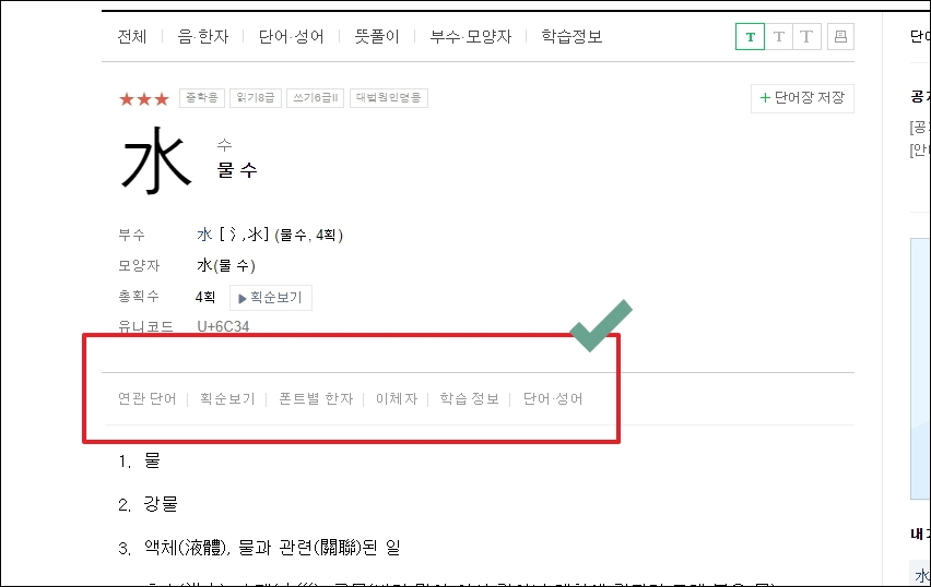 ▼저는 '물 수'자를 검색했습니다. 음, 한자, 단어, 성어, 뜻풀이, 부수, 모양자, 학습정보 이렇게 다양한 형식으로 결과를 얻을 수 있습니다. 하나의 한자에 대해 알아보겠습니다. '물 수'를 클릭해 보겠습니다.