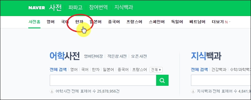 ▼네이버 사전 사이트에 접속하면 메뉴에서 [한자]를 클릭합니다. 한자 외에 영어, 국어, 일본어, 중국어, 프랑스어, 스페인어, 독일어 등 여러 가지 언어에 대한 사전 서비스를 제공하고 있습니다.