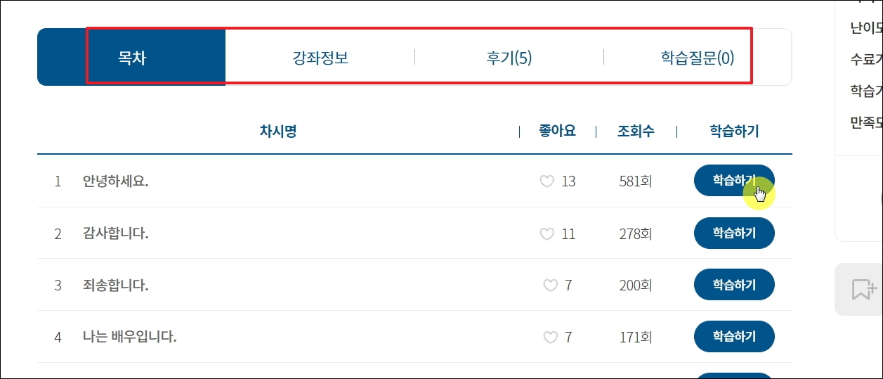 ▼강좌를 선택하면 목차, 강좌정보, 후기, 학습질문 이렇게 4가지 메뉴를 선택할 수 있습니다. 바로 중국어 배우기 위해서는 목차에서 원하는 차시의 [학습하기] 버튼을 클릭하면 됩니다.