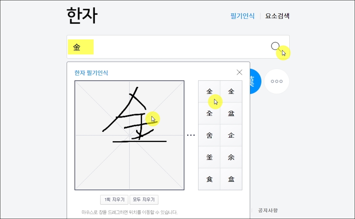 ▼간단한 방법으로 한자를 입력할 수 있는 한문 번역기의 필기인식 프로그램이 열렸습니다. 마우스로 한문을 그린 후, 우측에 나타난 몇 가지 문자 중에서 본인이 알아보고자 한 한자를 선택합니다. 그럼 검색창에 해당 한자가 입력된 것을 확인할 수 있습니다.