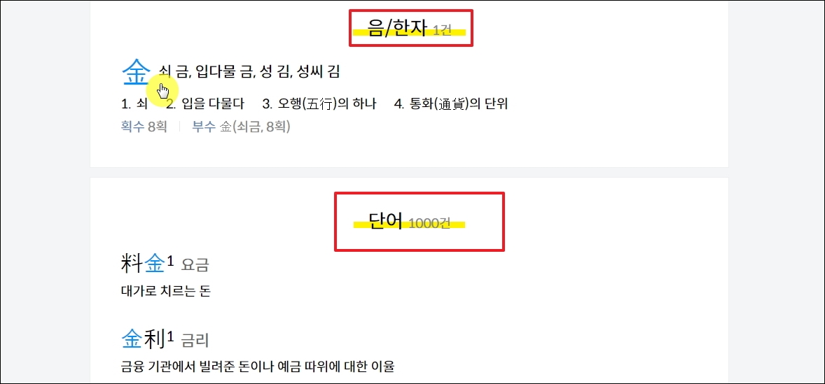 ▼검색 아이콘을 클릭하면 한문 번역기 결과를 확인할 수 있습니다. 하나의 문자에 대한 자세한 내용을 살펴볼 수 있습니다. 여기에 더하여 해당 문자를 포함하고 있는 단어나 고사성어도 나옵니다.