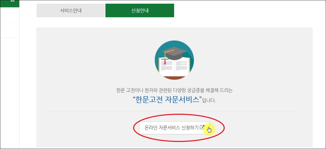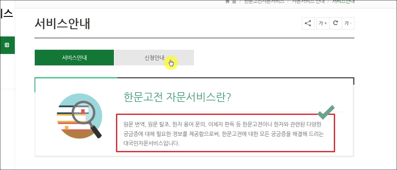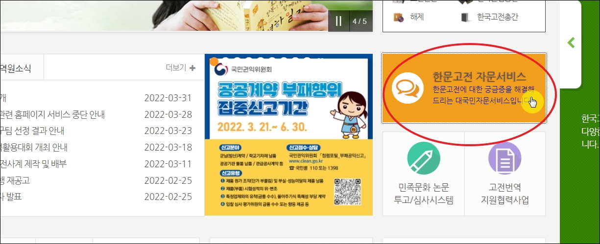 ▼사이트에 접속하면 우측 중단에 한문고전 자문서비스 메뉴가 있습니다. 클릭해 봅니다.