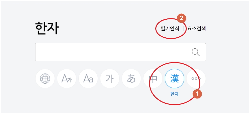 ▼어학사전 사이트에서 한문 번역기 찾는 방법을 알려드리겠습니다. 검색창 아래를 보면 여러 가지 사전 메뉴가 있습니다. 가장 우측에서 2번째에 위치한 한자 사전 메뉴를 클릭합니다. 그럼 검색창 위에 [필기인식] 메뉴가 나타나죠. 해당 메뉴를 클릭해 봅니다.