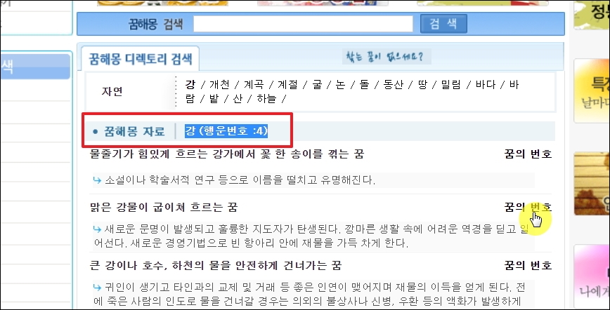 ▼저는 자연 카테고리에 속하는 강을 선택해 보았습니다. 꿈에 강이 나오면 숫자 4가 행운의 번호라고 합니다. 바로 아래에 있는 꿈해몽 자료의 내용을 읽어보고, 옆에 있는 [꿈의 번호] 버튼을 클릭해 봅니다.