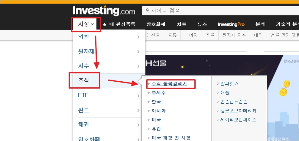 ▼인베스팅 홈페이지에 접속했습니다. 나스닥 종목에 관련된 자료를 얻기 위해서는 메뉴에서 [시장]과 [주식]을 순서대로 선택합니다. 그러면 하위 메뉴가 열리는데, 여기에서 [주식 종목검색기]를 선택합니다.