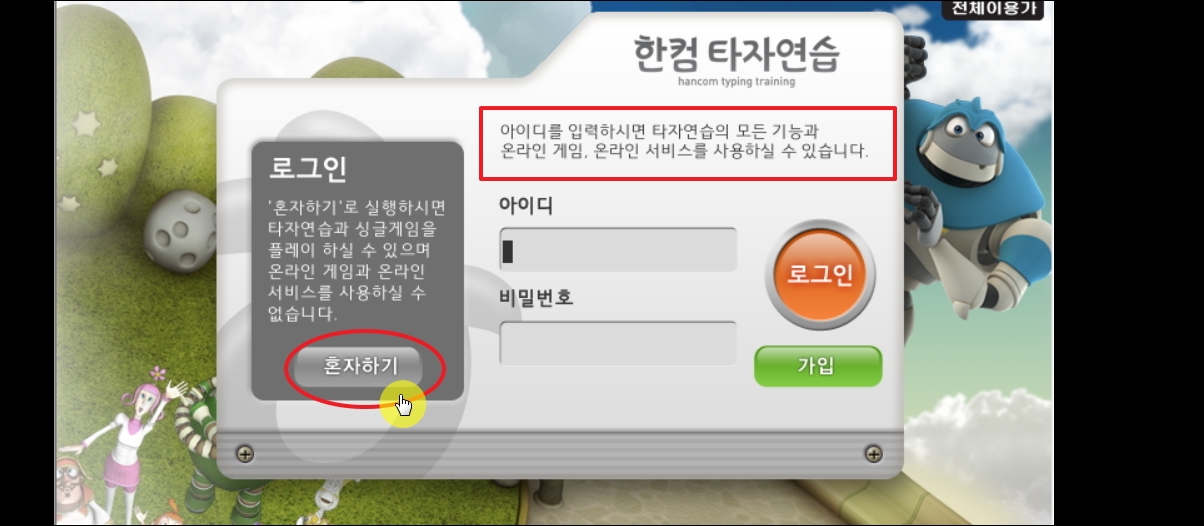 ▼설치가 완료되면 한글과컴퓨터 타자연습을 실행해 봅니다. 해당 프로그램을 이용할 때에는 로그인을 해도 되고, 로그인 없이 [혼자하기] 버튼을 클릭해도 됩니다. 랭킹을 확인하거나 온라인 게임을 즐기고 싶을 때에는 한컴 회원가입과 타자연습 프로그램 로그인을 해야 합니다. 회원가입 또한 무료 입니다.