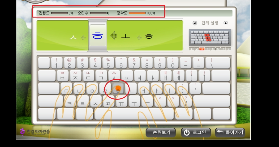 ▼키보드와 손가락 그림으로 잘 되어 있어서 자리연습을 하기 정말 좋습니다. 오타수, 정확도가 실시간으로 산출되기 때문에 본인 실력이 어느 정도 성장하고 있는지 알 수 있습니다.
