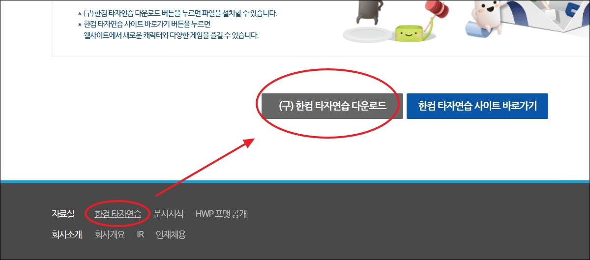 ▼한글과컴퓨터 사이트에 접속한 후 메인화면에서 좌측 하단에 있는 [한컴 타자연습] 메뉴를 클릭합니다. 그럼 한글과컴퓨터 타자연습 다운로드 버튼을 찾을 수 있습니다. 참고로 프로그램 설치 없이 타자연습을 하고 싶다면 [한컴 타자연습 사이트 바로가기]를 클릭하면 됩니다. 다운로드 버전에 비해 기능이 적을 수 있지만, 기본기는 충실한 서비스입니다.