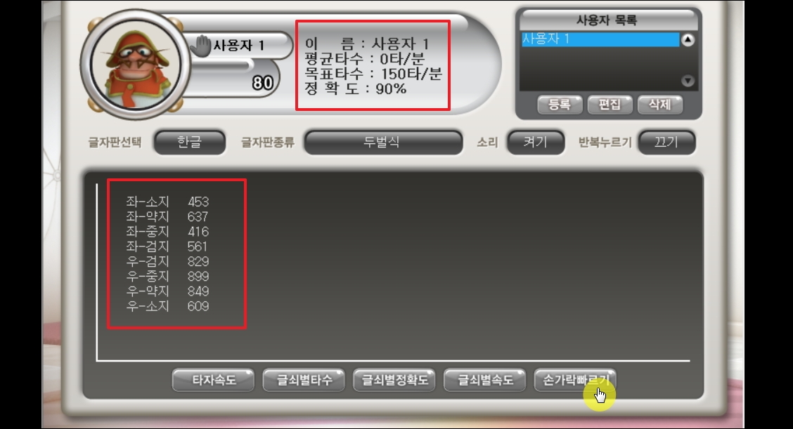▼한컴에서 제공하는 타자연습 소프트웨어는 2가지가 있습니다. 개인적으로 다운로드 버전을 선호합니다. 그 이유는 설치 후에 인터넷 연결이 되지 않은 컴퓨터에서도 연습을 할 수 있고, 다음과 같이 고퀄리티의 통계 시스템을 제공하고 있기 때문입니다. 다른 프로그램에서도 찾아볼 수 있는 정확도, 평균타수는 물론이고, 여기에 더하여 손가락 빠르기, 글쇠별 속도 및 정확도 등을 알아볼 수 있죠.