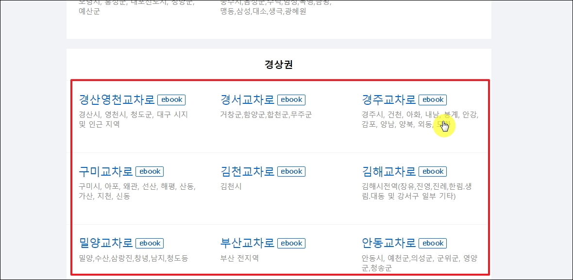 ▼알고 싶은 정보의 동네를 찾아야 합니다. 예를 들어 경상도에 있는 이화에 산다면 [경주교차로 ebook]을 선택해야 합니다. 여러 동네가 묶여 있는 경우가 있기 때문에 세부 지역에 대한 문구 확인이 필요합니다.