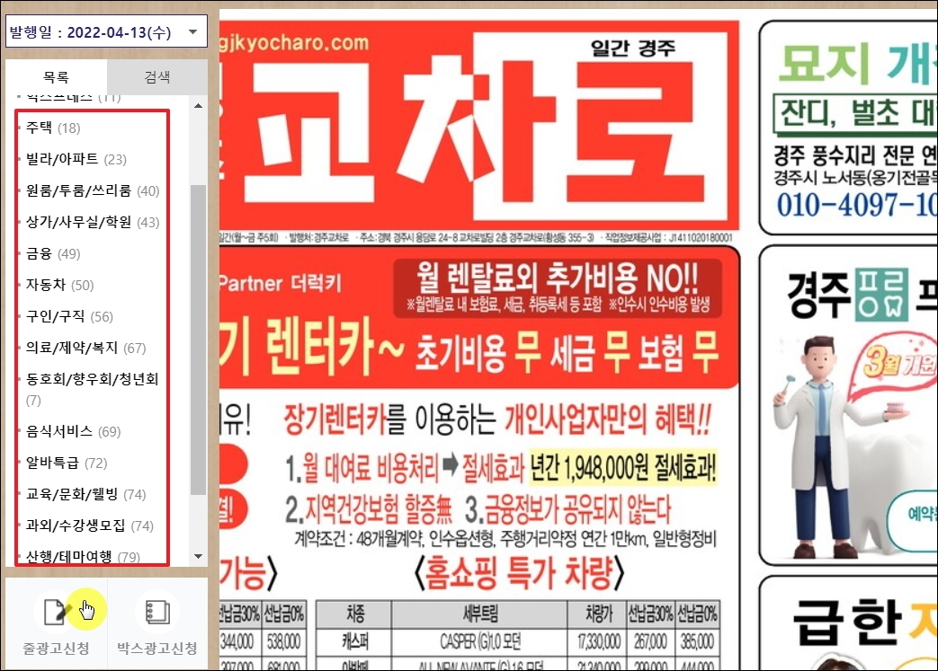 ▼저는 경주시, 건천, 이화, 내남, 봉계, 안강, 감포, 양남, 양북, 외동, 모화 지역의 생활 정보를 다루고 있는 경주교차로 신문 그대로보기를 선택했습니다. 주 5회 발행이 된다고 합니다. 날짜별로 그대로보기 서비스를 선택할 수 있습니다. 정보는 가장 최근의 것을 이용하는 것이 낫기 때문에 금일자를 선택했습니다.