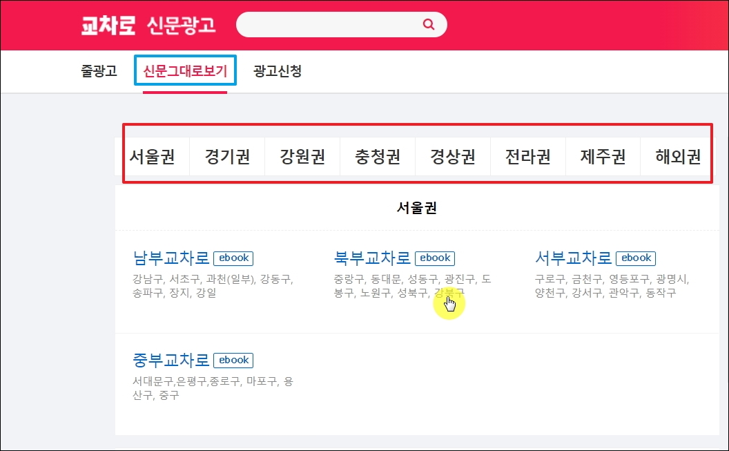 ▼[신문 이북] 메뉴를 선택하면 교차로 신문 그대로보기 페이지가 열립니다. 여기에서 원하는 지역의 컨텐츠를 선택하면 됩니다. 서울, 경기, 강원, 충청, 경상, 전라, 제주, 해외 이렇게 8개 카테고리로 나뉘어 있습니다.