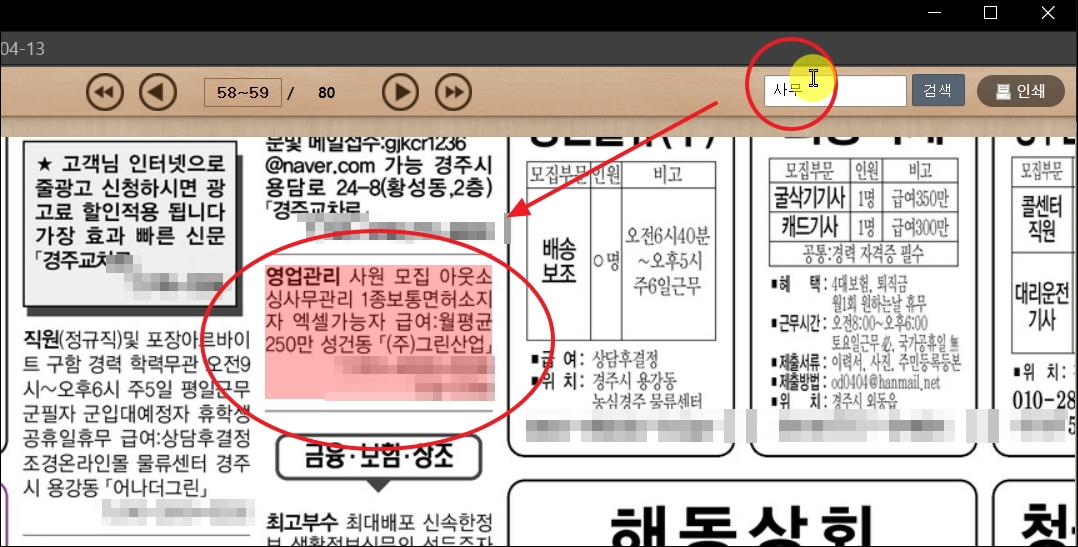 ▼신문 그대로보기 프로그램에서 우측 상단을 보면 검색을 할 수 있게 되어 있습니다. 키워드를 입력하고 [검색] 버튼을 누르면 해당 키워드가 포함된 내용을 쉽게 찾을 수 있습니다. 다음과 같이 빨간색 하이라이트 표시가 되기 때문에 바로 눈에 띕니다.