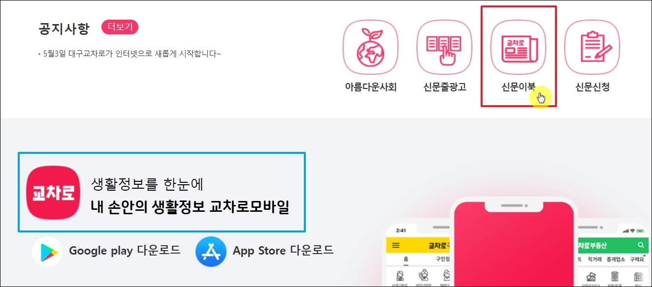 ▼교차로 공식 홈페이지에 접속했습니다. 공지사향 옆을 보면 아름다운사회, 줄광고, 신문신청 등의 메뉴가 있습니다. 여기에서 세 번째에 위치한 [신문 이북]을 클릭합니다. (참고로 교차로는 스마트폰으로 보는 것도 가능합니다. 모바일 버전을 사용하고 싶다면 구글 플레이스토어나 앱스토어에서 다운 받으면 됩니다.)