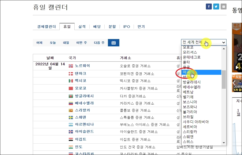 ▼노트웨이, 덴마크, 멕시코, 모로코, 방글라데시, 베네수엘라, 스리랑카, 스웨덴, 아르헨티나 등 전 세계 모든 증권 거래소에 대한 휴장일 확인이 가능합니다. 미국증시에 대한 것만 보고 싶으면 리스트에서 우측 상단에 위치한 "전 세계 전체"라고 표기되어 있는 셀렉트 박스를 클릭하면 됩니다. 그럼 여러 나라의 이름이 나오는데, 여기에서 "미국"을 선택하면 됩니다.