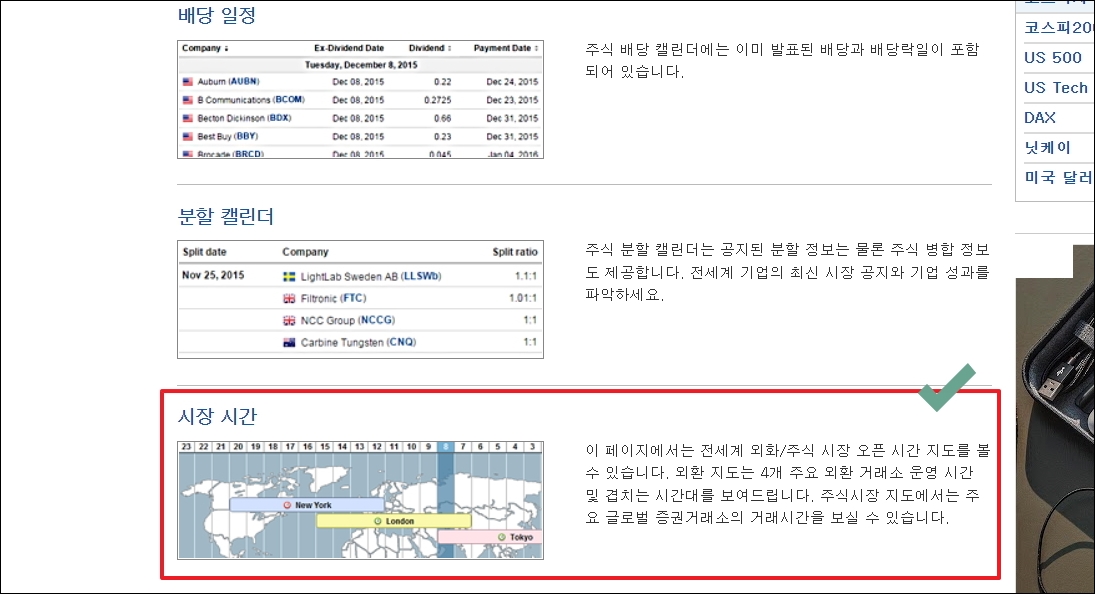 ▼좀 전에 도구 모음 메뉴를 선택했을 때 여러 캘린더 서비스가 나타났습니다. 이 중에서 [시장 시간]을 선택해도 미국증시 휴장에 대한 정보를 얻을 수 있습니다.