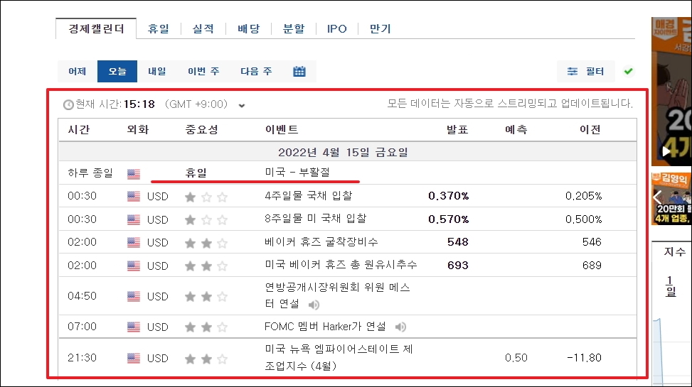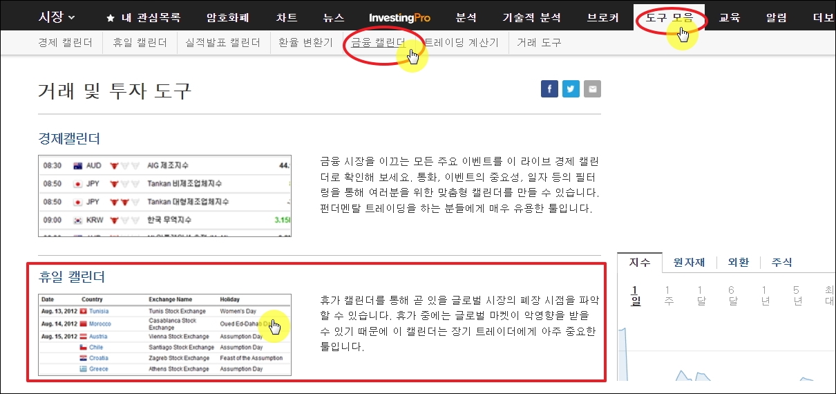 ▼이렇게 오늘 거래소 휴무에 대한 정보는 물론이고, 경제 관련 발표 결과와 일정을 정확하게 확인하는 방법을 알려드리겠습니다. 경제 관련 사이트로 유명한 인베스팅 홈페이지를 이용하면 됩니다.