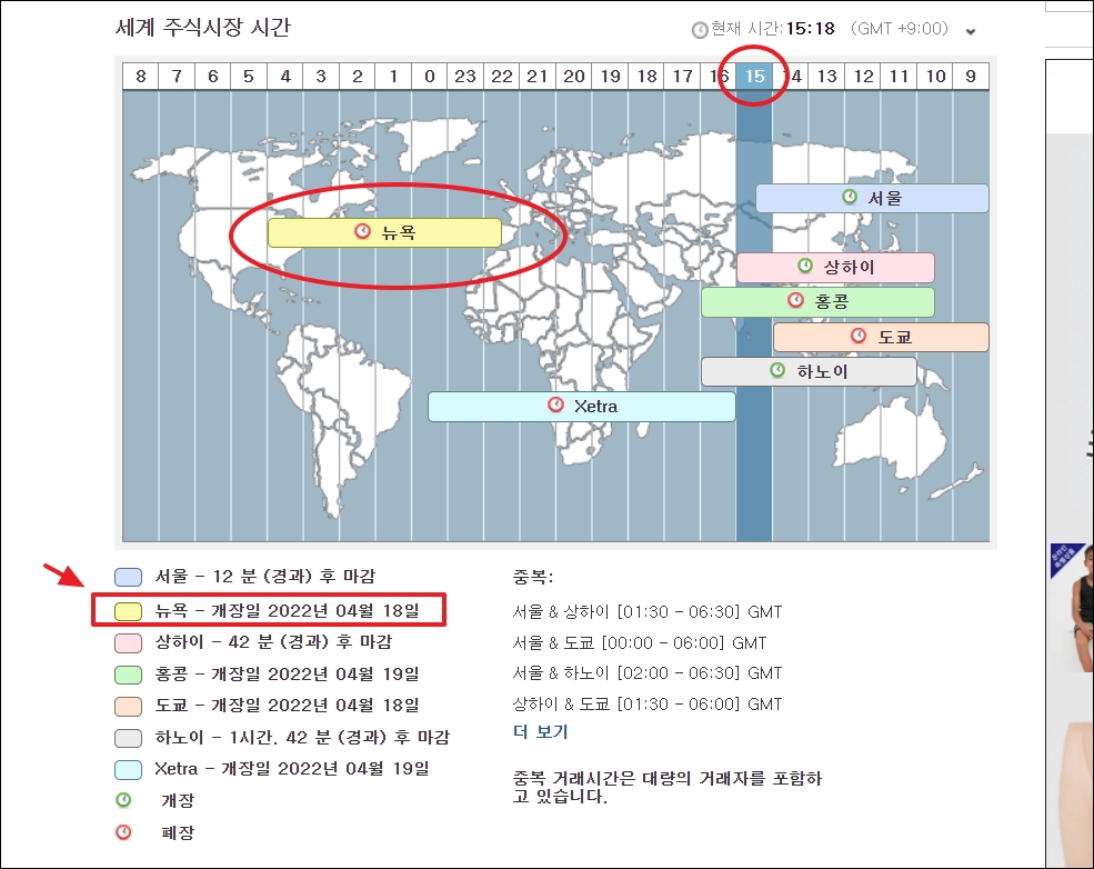 ▼[시장 시간]을 클릭하면 세계 주식시장 시간을 살펴볼 수 있는 세계지도 차트가 나옵니다. 시간이 변함에 따라 여러 증권 거래소가 열었는지 확인할 수 있습니다. 오늘은 미국증시가 열리지 않았기 때문에 뉴욕 부분에 개장일이 2022년 4월 18일로 표기되어 있음을 알 수 있습니다.