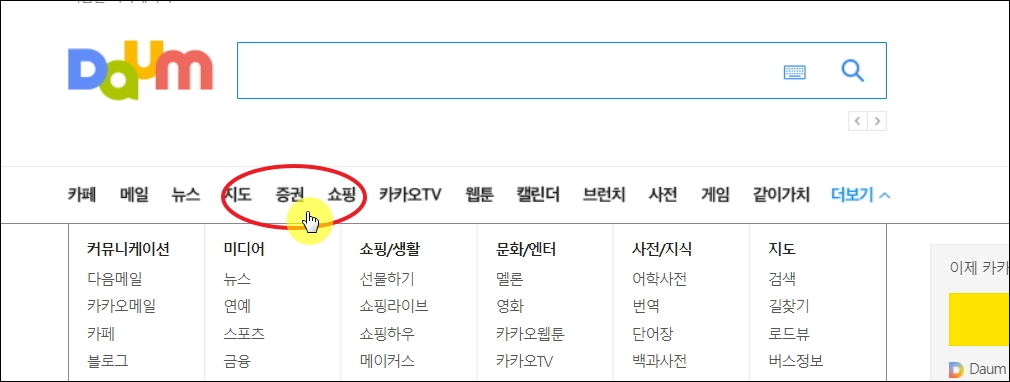 ▼전광판 서비스는 쉽게 이용이 가능합니다. 다음증권 사이트를 통해 사용이 가능하죠. 다음에서 보면 여러 메뉴가 있습니다. 이 중에서 5번째에 위치한 [증권]을 선택하면 해당 사이트로 이동하게 됩니다.