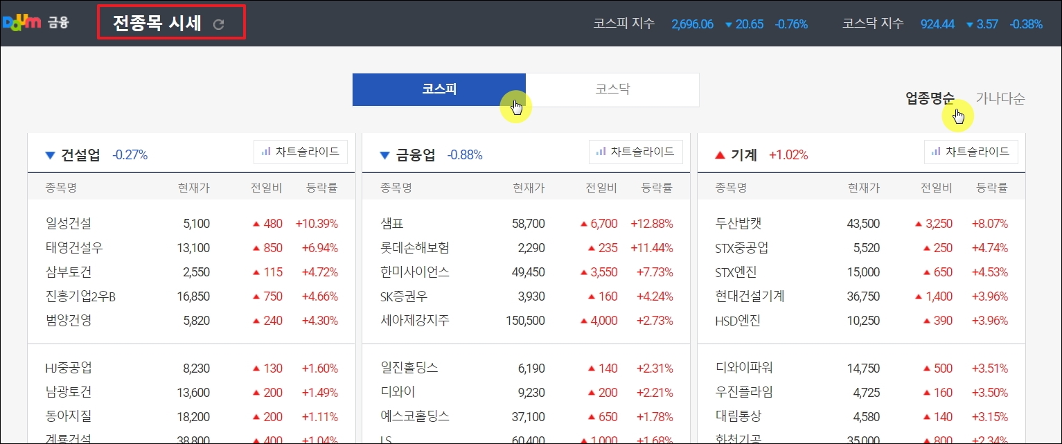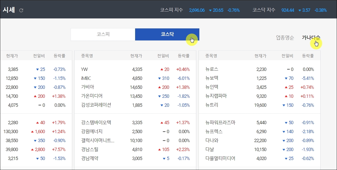 ▼가나다순으로 보면 원하는 종목의 주식시세를 빠르게 찾아볼 때 도움이 됩니다. 전종목 주식시세를 눈에 익히기에도 가나다순으로 보는 것이 낫다고 봅니다.