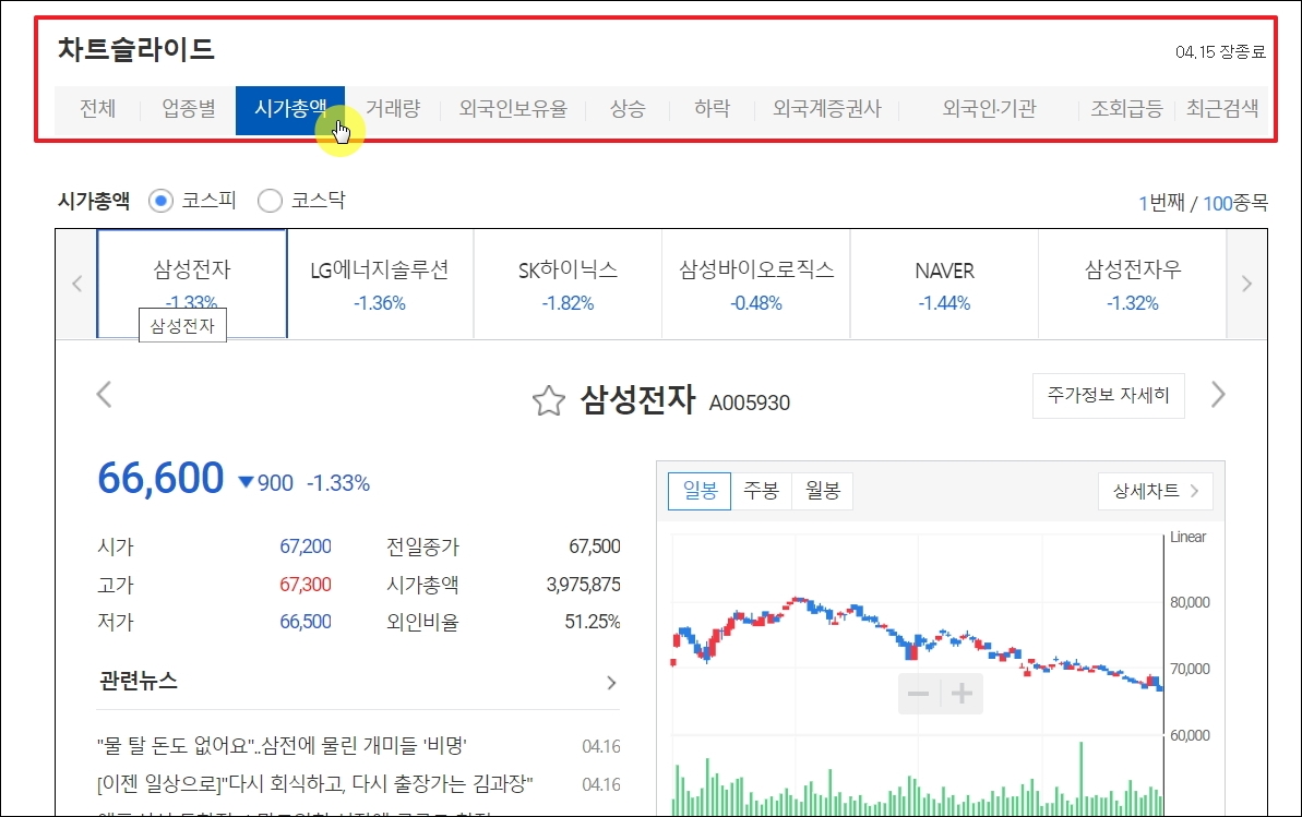 ▼차트 슬라이드 기능은 업종 외에도 시가총액, 거래량, 외국인 보유율 등 다양한 기준으로 여러 종목을 돌려볼 수 있습니다. 시가총액 순으로 돌려보면 국내 주식시장의 흐름을 파악하는 데에 도움이 됩니다.