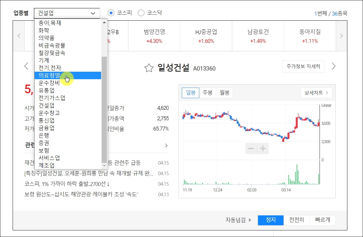 ▼업종별 셀렉트 박스를 클릭해 보면 코스피와 코스닥에 속한 모든 업종에 대한 차트 슬라이드 이용이 가능한 것을 알 수 있습니다. 건설업, 종이와 목재, 화학, 비금속광물, 기계, 운수장비, 유통업 등 많은 업종 중에서 관심 있는 것을 선택하면 됩니다.