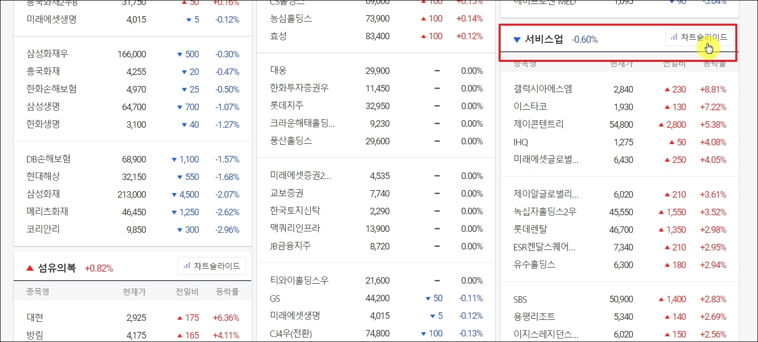 ▼서비스업에 대한 차트 슬라이드 페이지가 열렸습니다. 여기를 보면 서비스업에 속하는 주식 종목을 하나씩 모두 돌려보기 가능합니다. 화면에서 우측 하단에 보면 자동넘김 기능이 있는데, 해당 기능을 사용하면 마우스 클릭 없이 자동으로 종목을 바꾸며 주식시세 및 차트, 뉴스 등의 정보를 돌려보기 가능합니다.