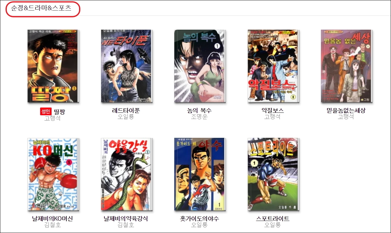 ▼순정, 드라마, 스포츠 장르에 해당하는 것으로는 놈의 복구, 악질보스, 믿을놈 없는 세상, 날제비의 KO머진 및 약육강식, 스포트라이트 등의 작품이 새롭게 업데이트 되었습니다.
