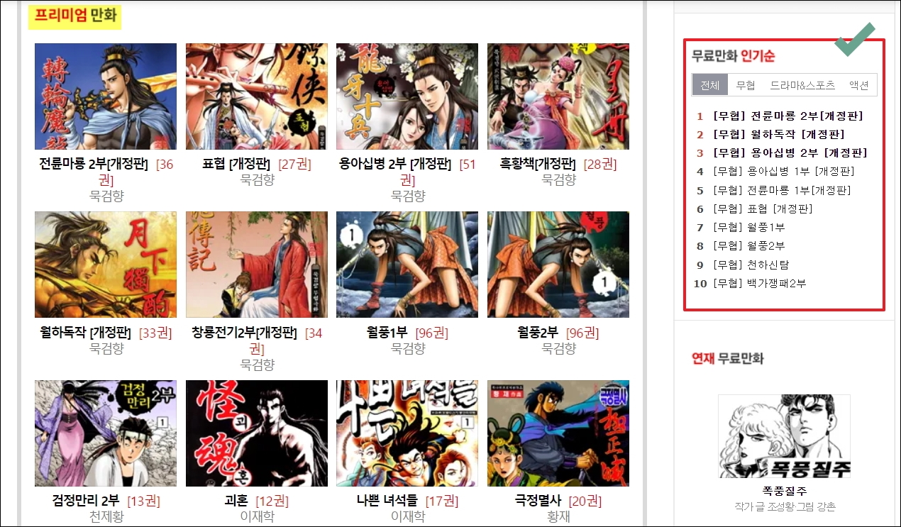 ▼금일 기준으로 업데이트된 무료만화 작품을 몇 가지 알려드리겠습니다. 무협 부분에서는 풍운삼형제, 극정멸사, 검정말리, 나쁜 녀석들, 괴혼, 흑황책, 전륜마룡, 표협, 용아십병, 월하독작 등이 있습니다. 국내 유명 작가인 고행석, 황재, 천제황, 이재학, 묵검향 등의 작품이 많습니다.