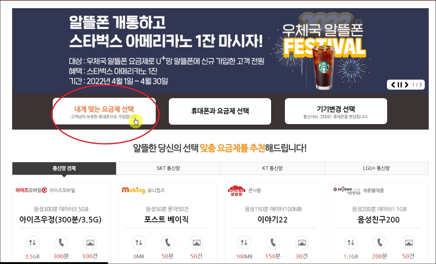 ▼최근 알뜰폰 개통을 하면 혜택을 받을 수 있는 이벤트가 열리고 있습니다. 저렴한 요금제를 사용함과 동시에 혜택까지 받을 수 있으니 1석 2조입니다. 그럼 본인에게 맞는 데이터 무제한 요금제를 찾는 데에 유용한 [내게 맞는 요금제 선택] 메뉴를 선택합니다. 참고로 휴대폰도 이곳에서 구매가 가능합니다. 기기가 없는 분들은 [휴대폰과 요금제 선택]을 선택하면 됩니다.
