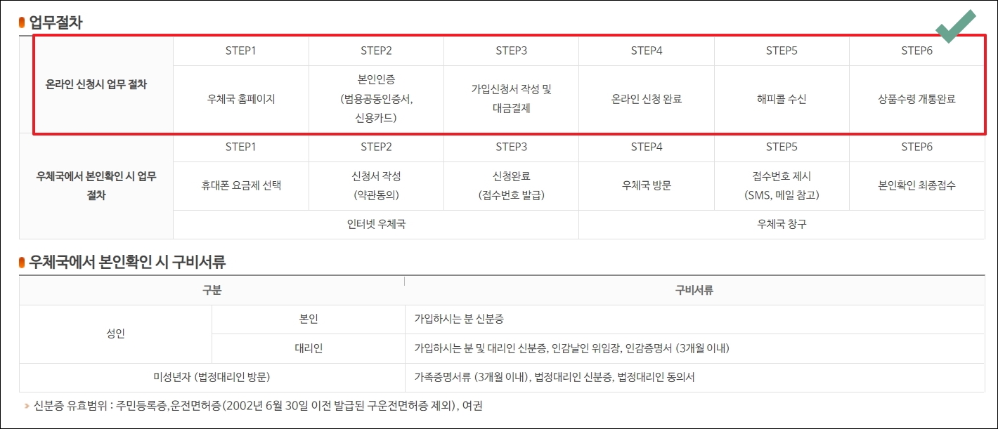 ▼온라인으로 알뜰폰 요금제 가입을 하는 절차는 다음과 같습니다. 홈페이지에서 본인인증을 한 후 신청서를 작성하면 됩니다. 그 다음 해피콜을 받아 내용 확인 및 가입 진행 여부에 대한 답변을 한 후 유심을 받아 개통을 완료하면 됩니다. 우체국 방문을 통해 진행하는 것도 가능합니다. 이 때에 구비 서류가 있으니 필히 참고하시길 바랍니다.