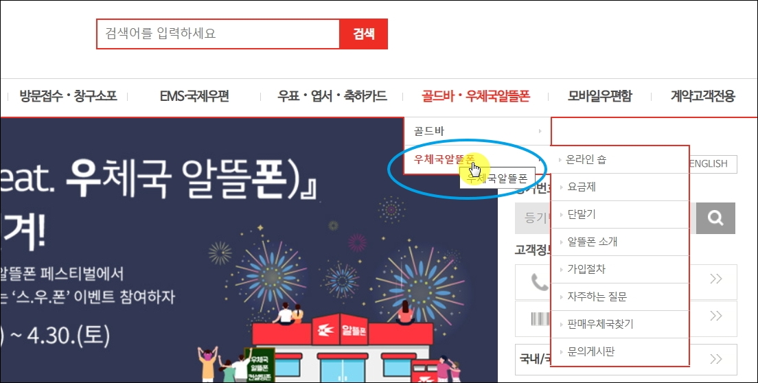 ▼인터넷 우체국 사이트에 접속했습니다. 원래 이곳에서는 인터넷을 통해 우편이나 소포, 내용증명 등을 보내는 서비스를 주로 했습니다. 가장 최근에 추가된 서비스가 알뜰폰 서비스죠. 메뉴에서 [골드바 및 우체국알뜰폰]을 선택하면 바로 이용이 가능합니다.