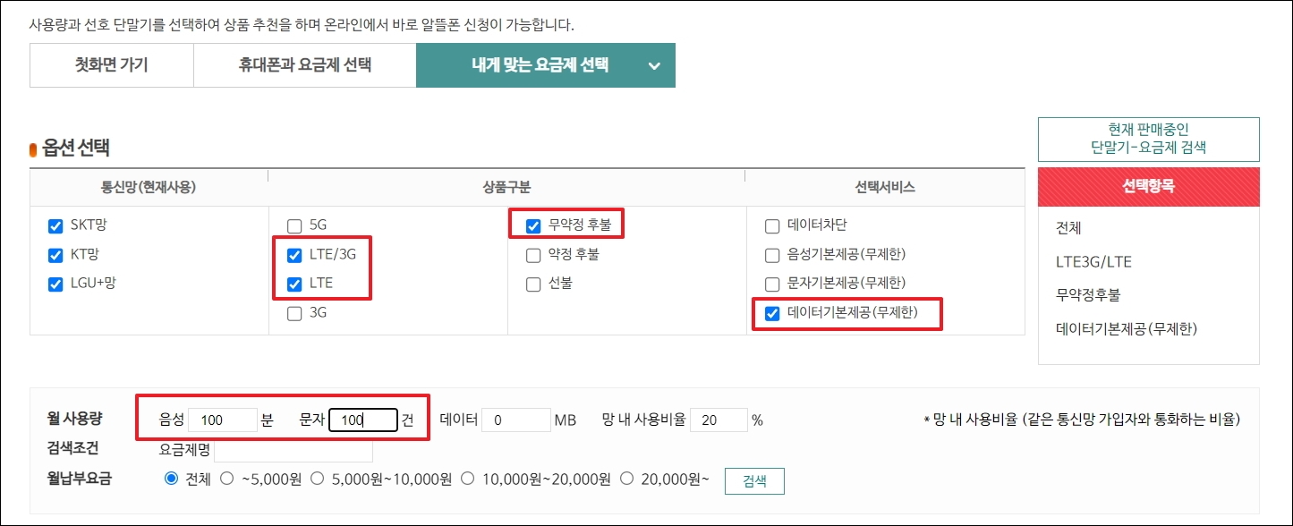 여기에 더하여 월 사용량 부분에 본인의 휴대폰 사용 패턴에 맞게 음성과 문자 사용량을 입력합니다. 제 경우에는 음성 100분, 문자 100건으로 설정해 보았습니다.