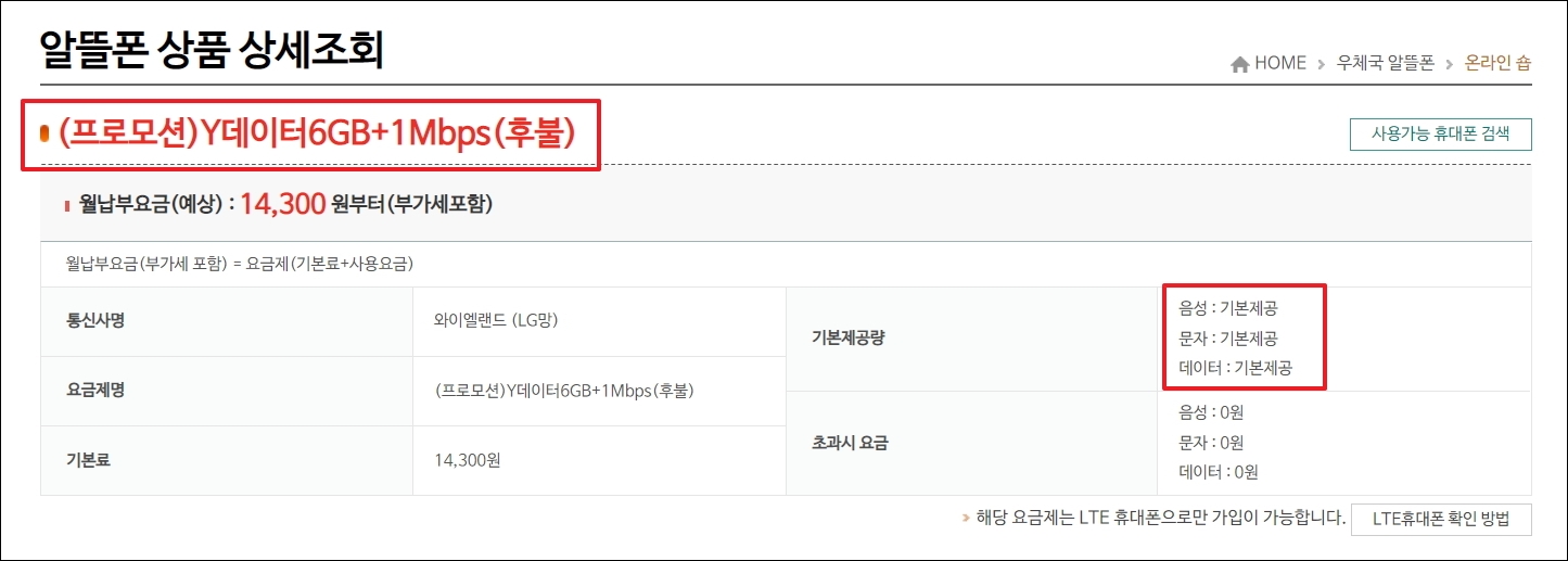 ▼프로모션을 진행하는 요금제를 사용하면 할인 혜택을 많이 받을 수 있습니다. 저는 LG망을 사용하고 있는 와이엘랜드의 14,300원 짜리가 마음에 듭니다. 음성, 문자를 무제한으로 사용할 수 있기 때문입니다. 데이터의 경우에는 6GB로 넉넉하고, 그 이상을 사용하면 1Mbps의 속도로 무제한 사용이 가능합니다.