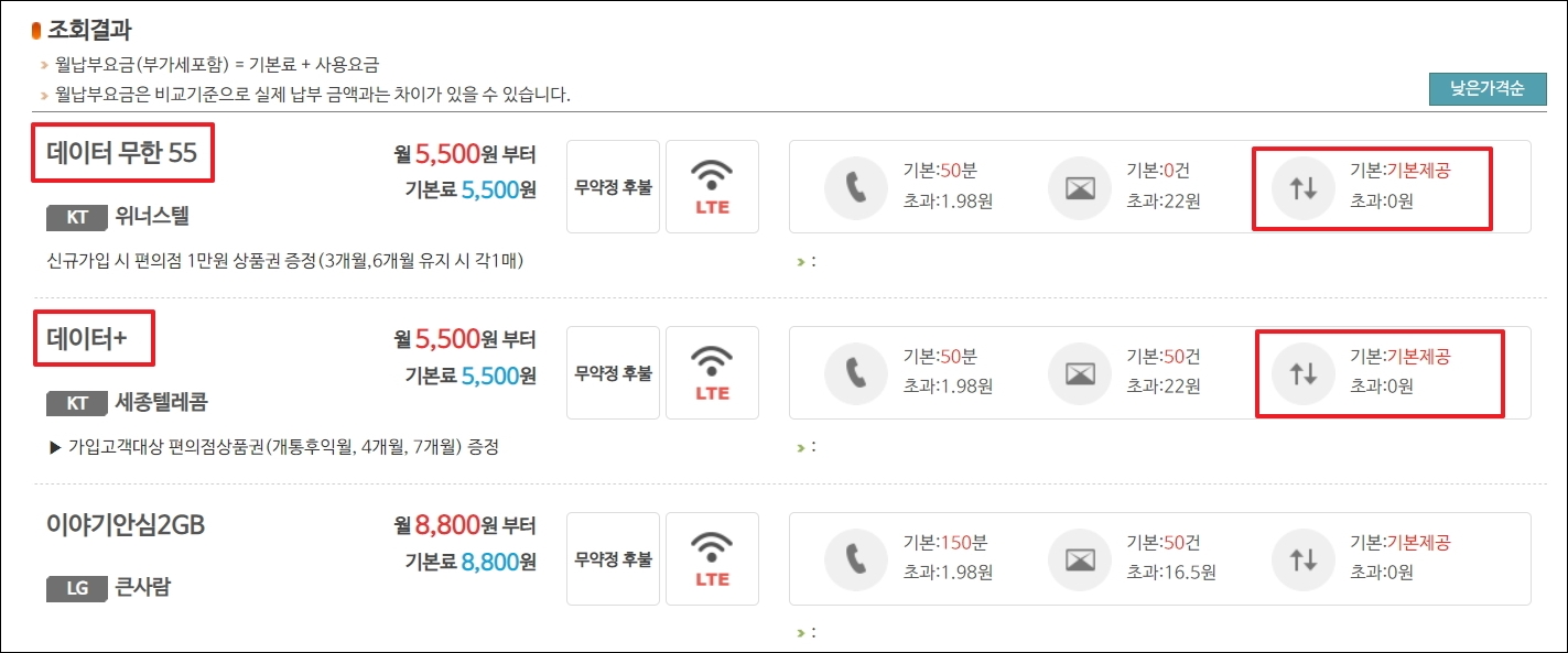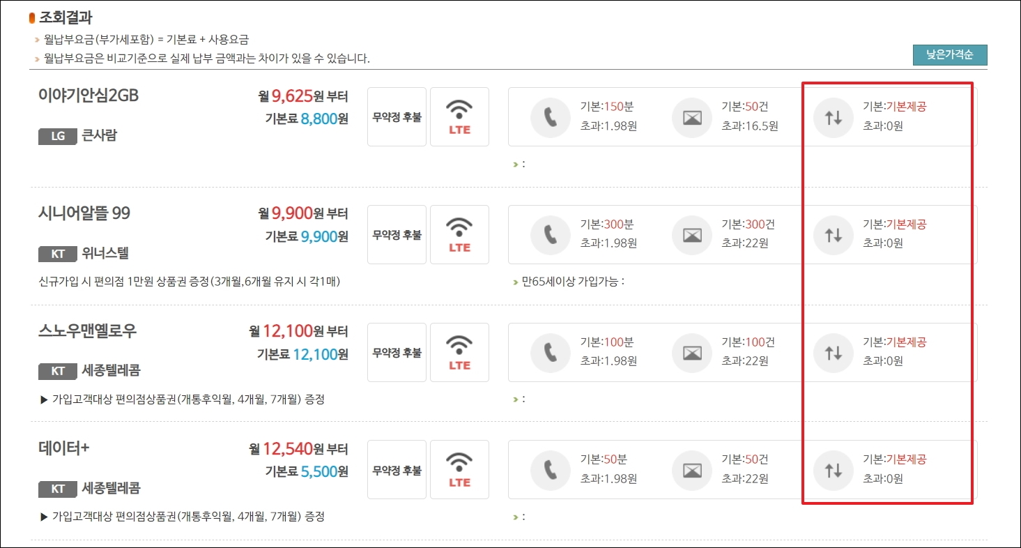 ▼검색 결과가 나왔습니다. 간단한 정보를 나타내고 있는 리스트를 통해 쉽게 요금제 비교를 할 수 있습니다. 데이터 부분에 "기본제공" 문구가 있으면 데이터를 무제한으로 사용할 수 있는 알뜰폰 요금제를 의미한다고 보면 됩니다. 속도는 명시가 되어 있지 않기 때문에 QOS를 반영한 것인지는 업체에 문의해야 정확히 알 수 있습니다.