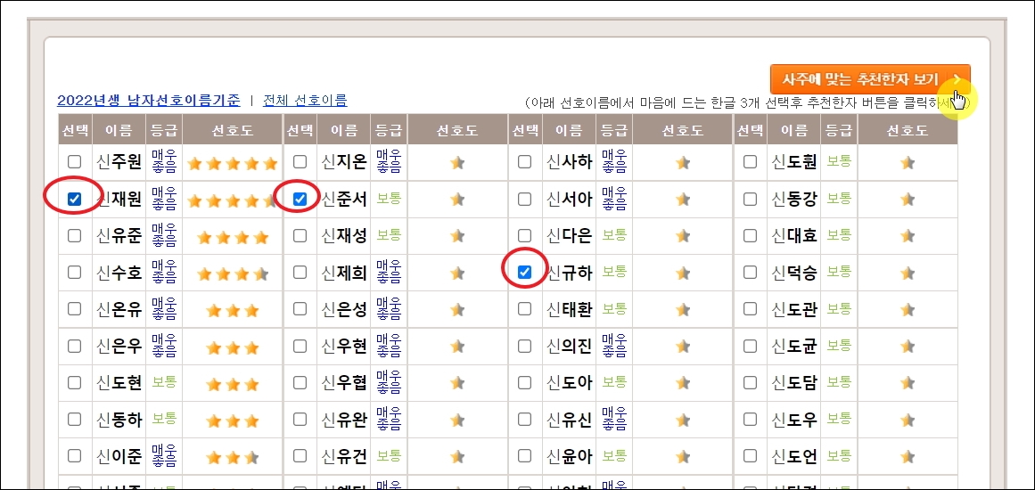 ▼2022년에 인기가 있는 성명을 고를 수 있는 페이지가 열렸습니다. 요즘에는 남자 아기 임에도 불구하고, 여기 추천 목록에서 볼 수 있듯이 여성스럽거나 중성적인 느낌의 이름을 사용하는 경우도 많습니다. 마음에 드는 것을 3개 선택한 후 [사주에 맞는 추천한자 보기] 버튼을 클릭합니다. 그럼 추천 한자 15개를 얻을 수 있습니다.