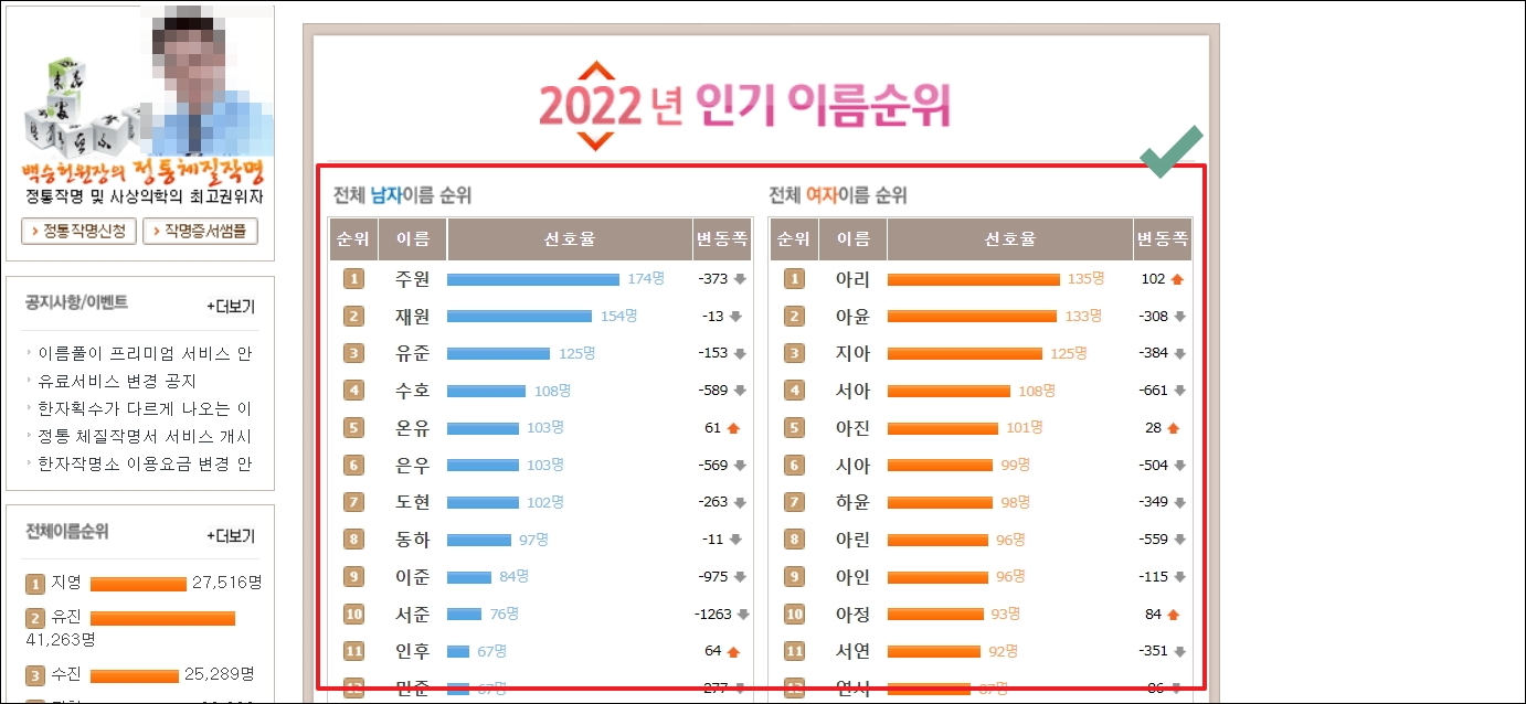 ▼제가 이용하는 온라인 작명 사이트에서는 올해 인기 있는 이름순위를 발표했습니다. 남자 아기의 경우 주원, 재원, 유준이 1위에서 3위를 차지했고, 여자 아기의 경우에는 아리, 아윤, 지아의 인기가 높게 나왔습니다. 인기 순위의 경우 계속 변동이 있기 때문에 직접 사이트에 접속해서 확인하는 것이 좋습니다.