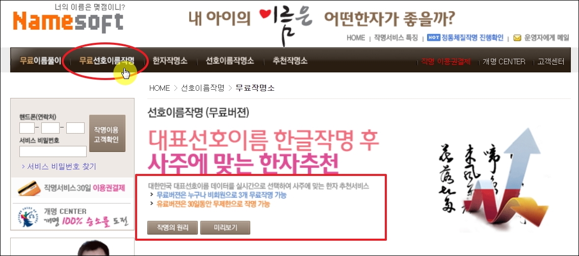 ▼사이트에 접속했습니다. 메뉴를 보면 이곳에서 이용할 수 있는 무료 서비스 2가지를 찾을 수 있습니다. 첫째는 풀이이고, 또 둘째는 이름 짓기 입니다. 이번 시간에는 두 번째인 [무료 선호 이름 작명]을 선택하여 아기 이름을 지어보도록 하겠습니다. (참고로 사이트 좌측 하단에 보면 인기 순위를 확인할 수 있는 메뉴 버튼이 있으니 필요한 분들은 이용해 보시길 바랍니다.)