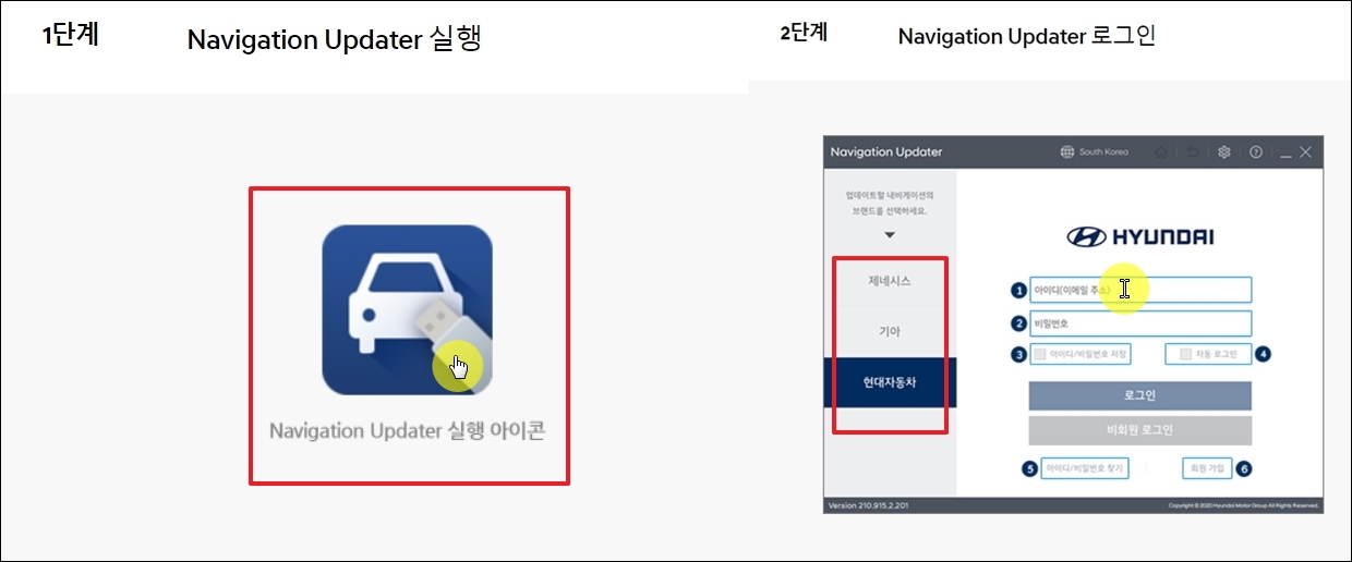 ▼현대자동차 내비게이션 업데이터 프로그램에 대한 설치가 완료되면 [Navigation Update 실행 아이콘]을 클릭하여 프로그램을 실행 시켜 줍니다. 그럼 창이 하나 열리는데, 좌측에 있는 메뉴를 보면 제네시스, 기아, 현대자동차를 선택할 수 있습니다. 여기에서 세 번째 메뉴를 선택한 후, 현대자동차 아이디로 로그인을 합니다. 회원가입이 안된 분들은 [비회원 로그인] 버튼을 사용해도 됩니다.
