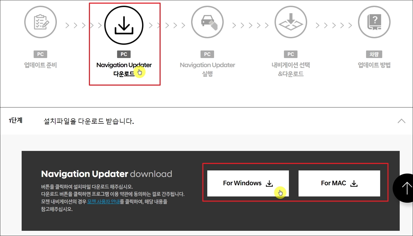▼새롭게 열린 웹페이지를 보면 앞서 보여드린 네비게이션 업그레이드 진행 5단계가 보일 겁니다. 여기에서 [Navigaion Updater 다운로드] 아이콘을 클릭합니다. 그럼 업그레이드 진행 시 필요한 프로그램을 다운로드 받을 수 있습니다. 윈도우 전용과 맥북 전용 설치 파일이 마련되어 있으니 본인이 사용하는 컴퓨터에 맞는 것을 선택하면 됩니다.
