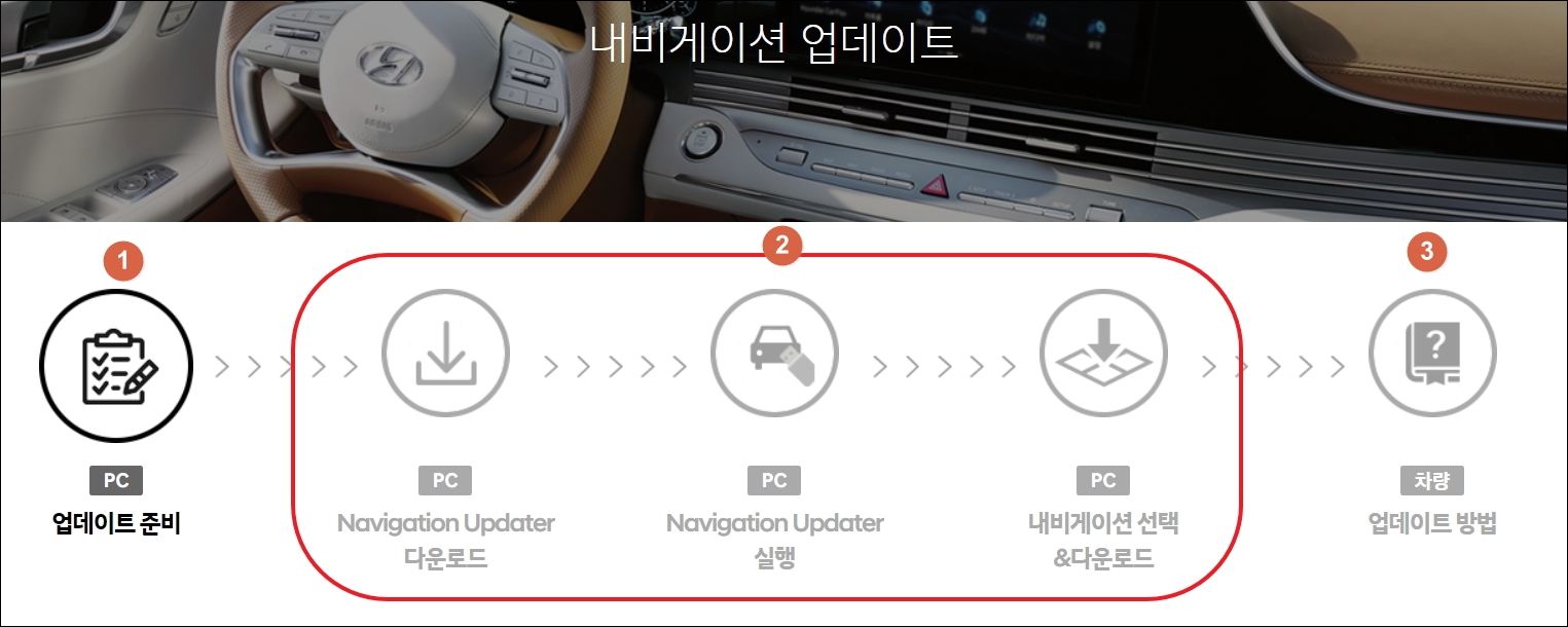 ▼전체적으로 내비게이션을 업그레이드 하는 과정을 살펴보고, 각 과정에서 어떻게 진행하면 되는지 알려드리겠습니다. 다음과 같이 진행 과정은 크게 5가지로 구분됩니다. 여기에서 2번 영역에 해당하는 과정은 컴퓨터 사용이 요구됩니다. 3번 영역에서는 차량에 진행하는 단계로써, 내비게이션 화면 터치로 쉽게 진행이 가능합니다.