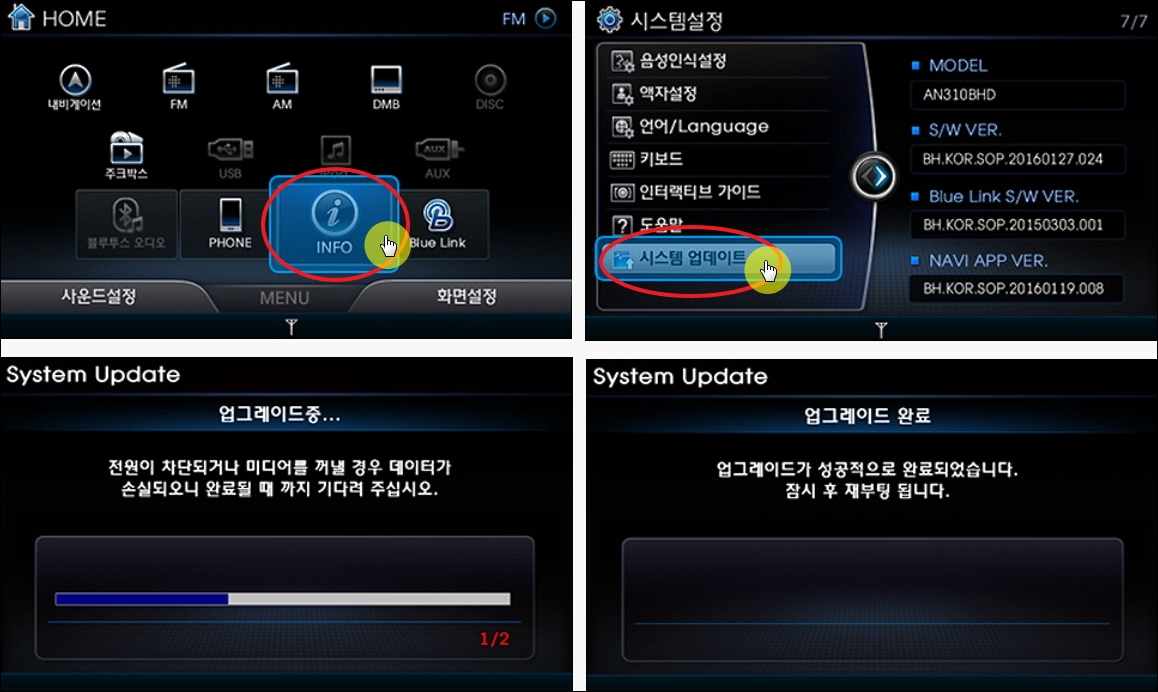 ▼이동식 저장 매체에 내비게이션 업그레이드 관련 파일이 저장한 상태에서 현대자동차 차량에 해당 매체를 삽입합니다. 그 다음 다음과 같은 화면에서 INFO, 시스템 업데이트, USB 업데이트를 순서대로 선택하면 됩니다.