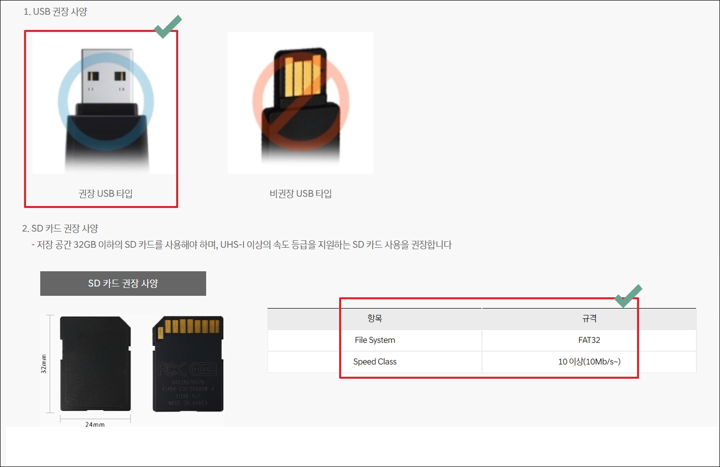▼앞서 언급한 바와 같이 현대자동차 내비게이션 업그레이드 방법을 진행하기 위해서는 차량에 맞는 USB 또는 SD카드를 준비해야 합니다. 다음과 같은 권장 USB와 SD카드 규격을 참고하시길 바랍니다.