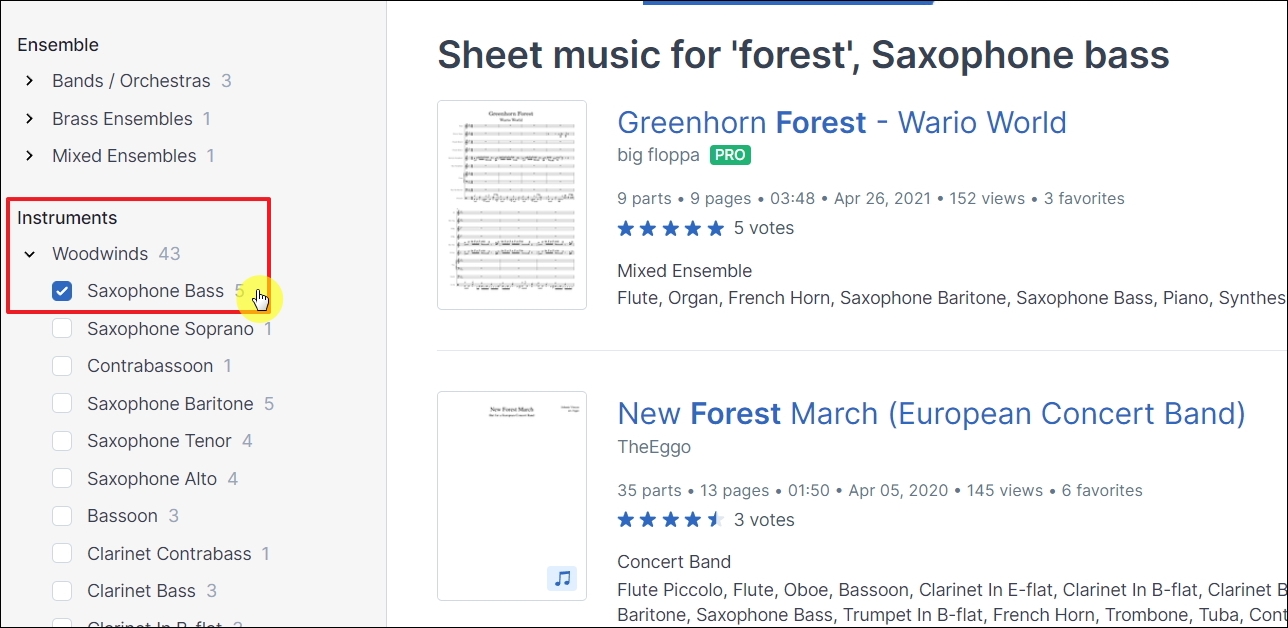 ▼이번에는 색소폰 연주에 적합한 악보를 찾아보겠습니다. Instruments 카테고리에서 Woodwinds에 있는 Saxophone을 선택하면 됩니다. 색소폰 옆에는 Bass, Soprano, Baritone, Tenor, Alto 등이 표시되어 있으니 이것도 참고 바랍니다.